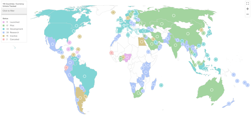 W Chinach już działa cyfrowy Yuan. Istnieją też inne kraje, których prace w tym zakresie są na zaawansowanym etapie. Kraje na całym świecie pracują nad tą formą cyfrowej gotówki (póki co nie ma wśród nich Polski, ale jest Unia Europejska). Zobacz tylko na tę mapę: