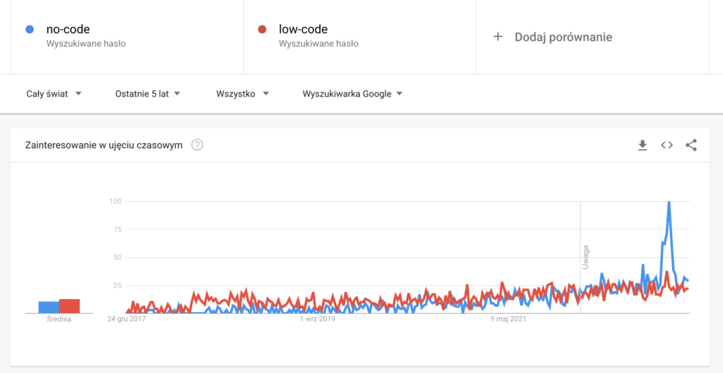 Istnieją również narzędzia typu low-code, które są bardzo podobne do no-code, ale w ich przypadku podstawowe umiejętności programowania mogą być wymagane. Ten segment również w ostatnio mocno się rozwija.
